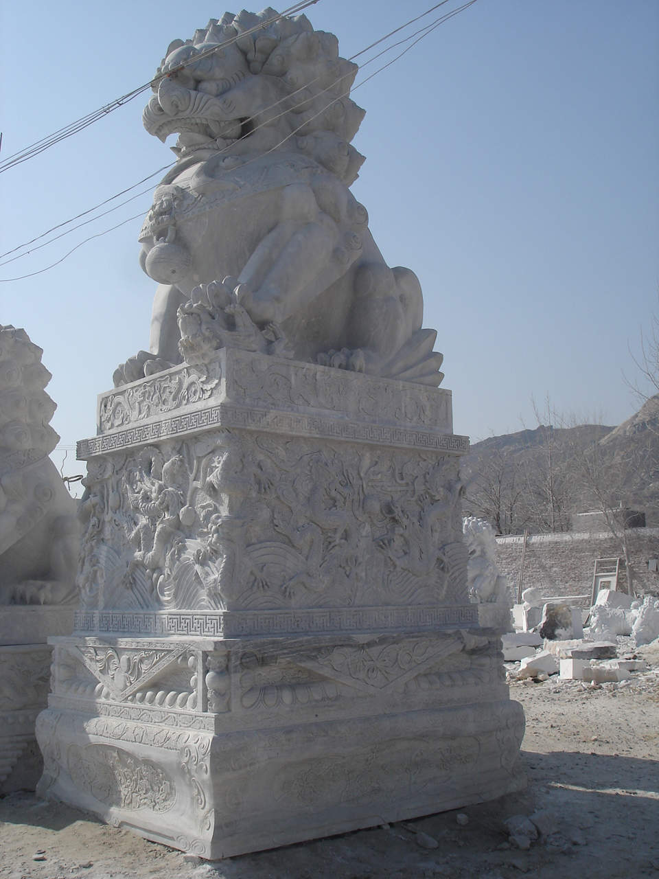 雕刻的石獅取材廣泛,多用砂巖、大理石和花崗石雕成。其中,北京天安門前的漢白玉大石獅、盧溝橋上的“石獅群”等石雕十分著名。其他如成都武侯祠、文殊院、寶光寺等寺廟大門兩側(cè)的石獅、??诤H鹉骨笆{、蘇州北寺石獅、孔府門前石獅等石雕,雕刻技藝精細(xì),風(fēng)格各有特點。